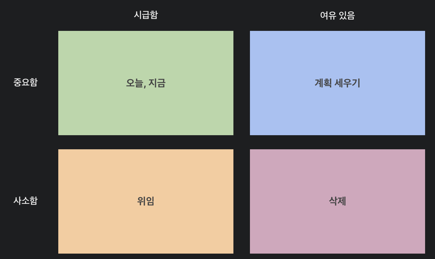 만약 결제 서버 작업을 한다고 했을 때에도 일단 API 스펙을 결정하는 작업을 중요함 / 시급함에 넣고 후순위로 처리해도 되는 작업은 중요함 / 여유있음에 넣어놓듯 말이다.
