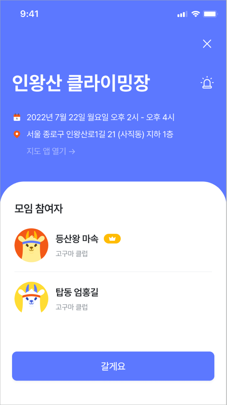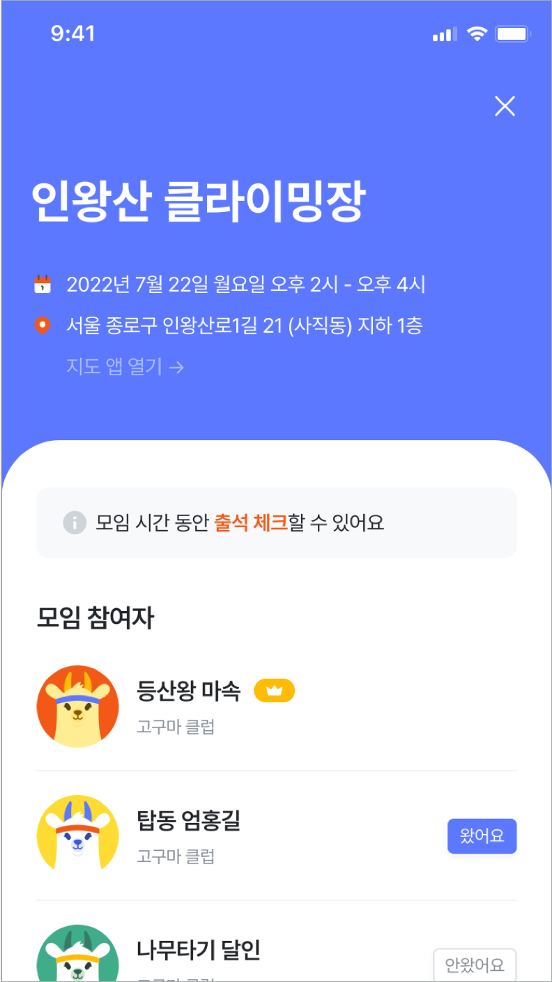 해당 화면을 통해 모임이 열리는 장소와 시간, 모임에 참석하는 참석자를 간단하게 확인할 수 있다.
