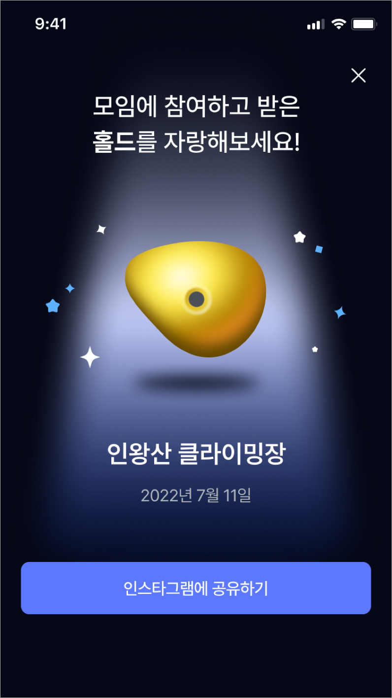 그래서 모임에 참석하고 출석체크까지 완료된 경우 홀드 이미지를 랜덤으로 줄 수 있도록 했으며 이는 인스타그램에 바로 업로드할 수 있도록 구현을 했다.