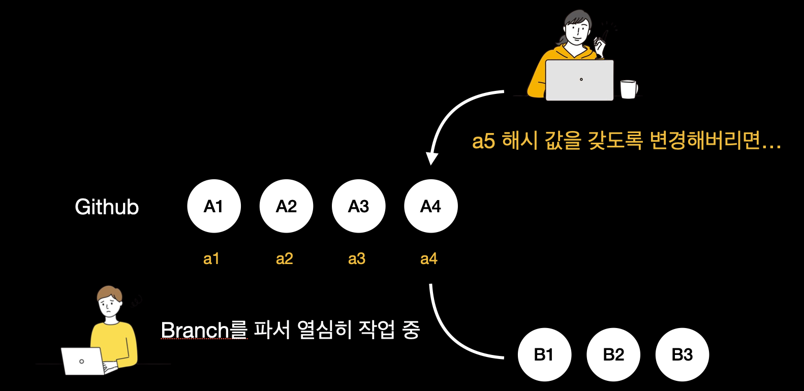 아예 이전 커밋 기록이 덮어씌워지면서 기존 다른 코드를 기반으로 작업했던 개발자들에게 혼선을 줄 수 있고 이로 인해 Conflict이 발생할 가능성이 크기 때문이다.