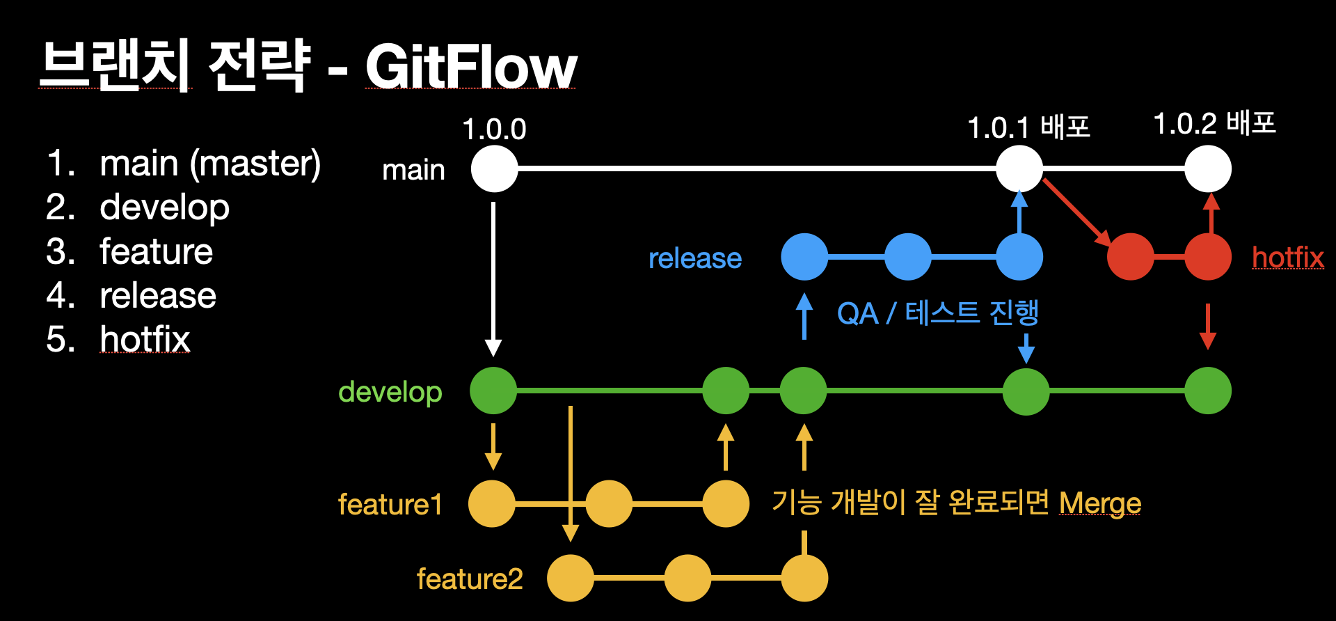 - release : 배포 전 QA / 테스트가 진행되는 브랜치