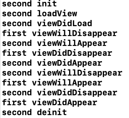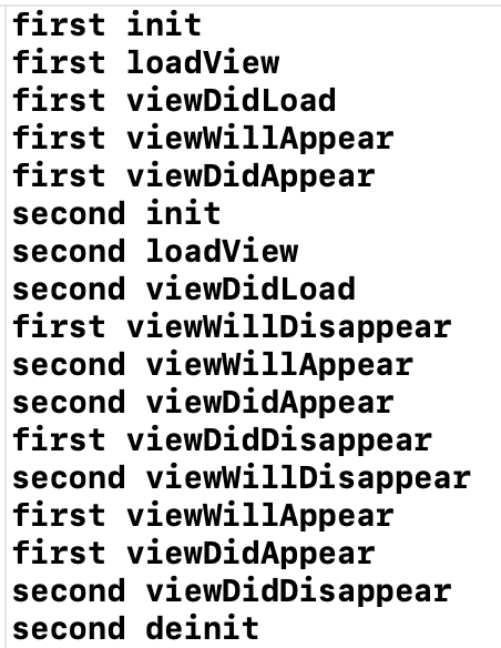 second init -> second loadView -> second viewDidLoad -> second viewWillAppear -> second viewDidAppear