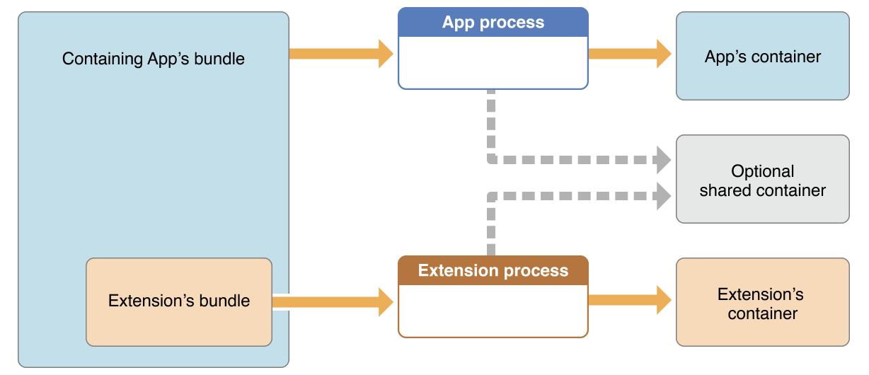 기존 앱과 Extension의 경우 각자 서로의 데이터 컨테이너를 가지고 있으며, 이에 직접 엑세스할 순 없다.