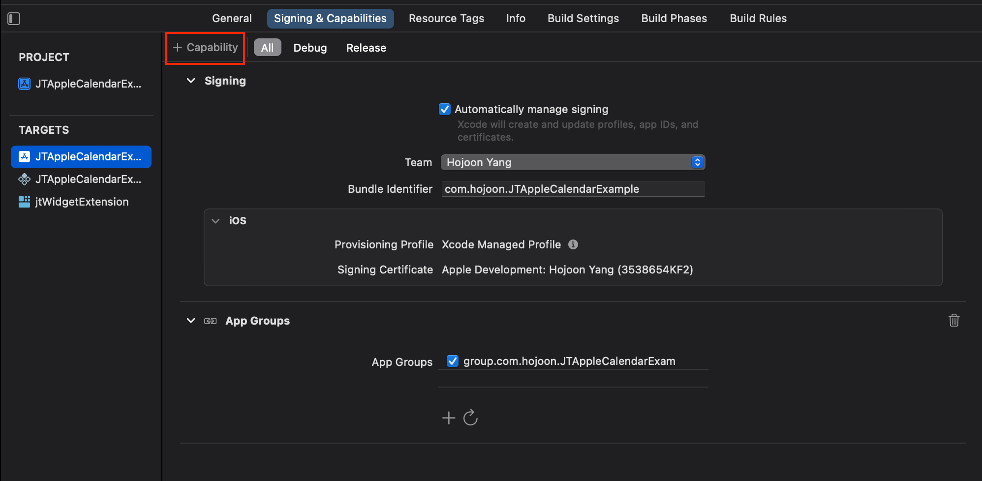 여기서 중요한 점은 AppGroups로 공유할 Extension의 Target도 AppGroup Capability를 추가해줘야 한다는 것이다.