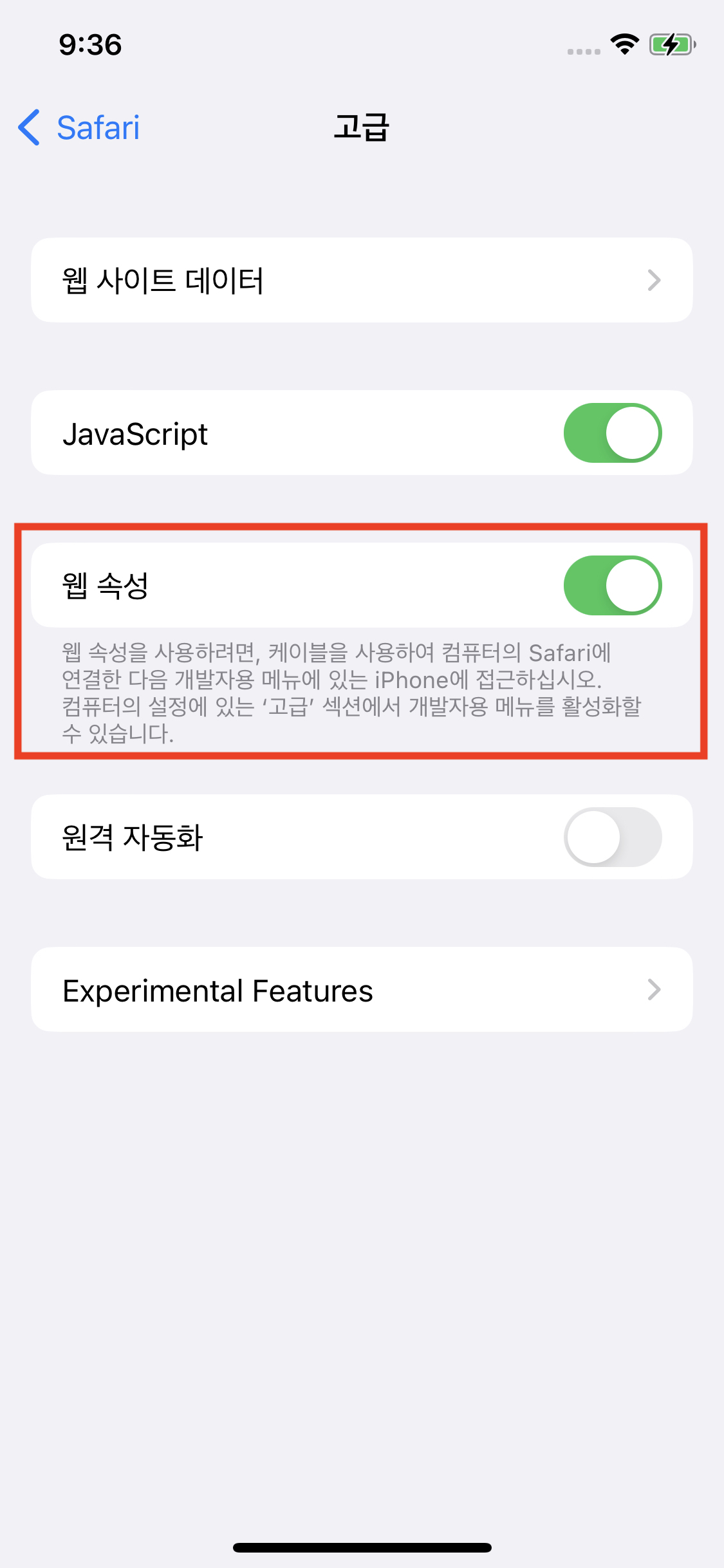 아이폰 설정 > Safari > 고급 > 웹 속성 활성화