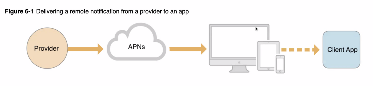 - Remote Notification: 아래 그림처럼 Provider(서버)가 따로 존재한다. 그리고 APNs(애플 푸시 노티피케이션 서비스)를 무조건 거쳐야 한다. 이때 모든 정보가 100% 전달되는 것은 장담할 수 없다고 나왔있다. 서버끼리의 통신 장애나 장기간의 기기 꺼짐 등으로 데이터가 누실될 수 있다.